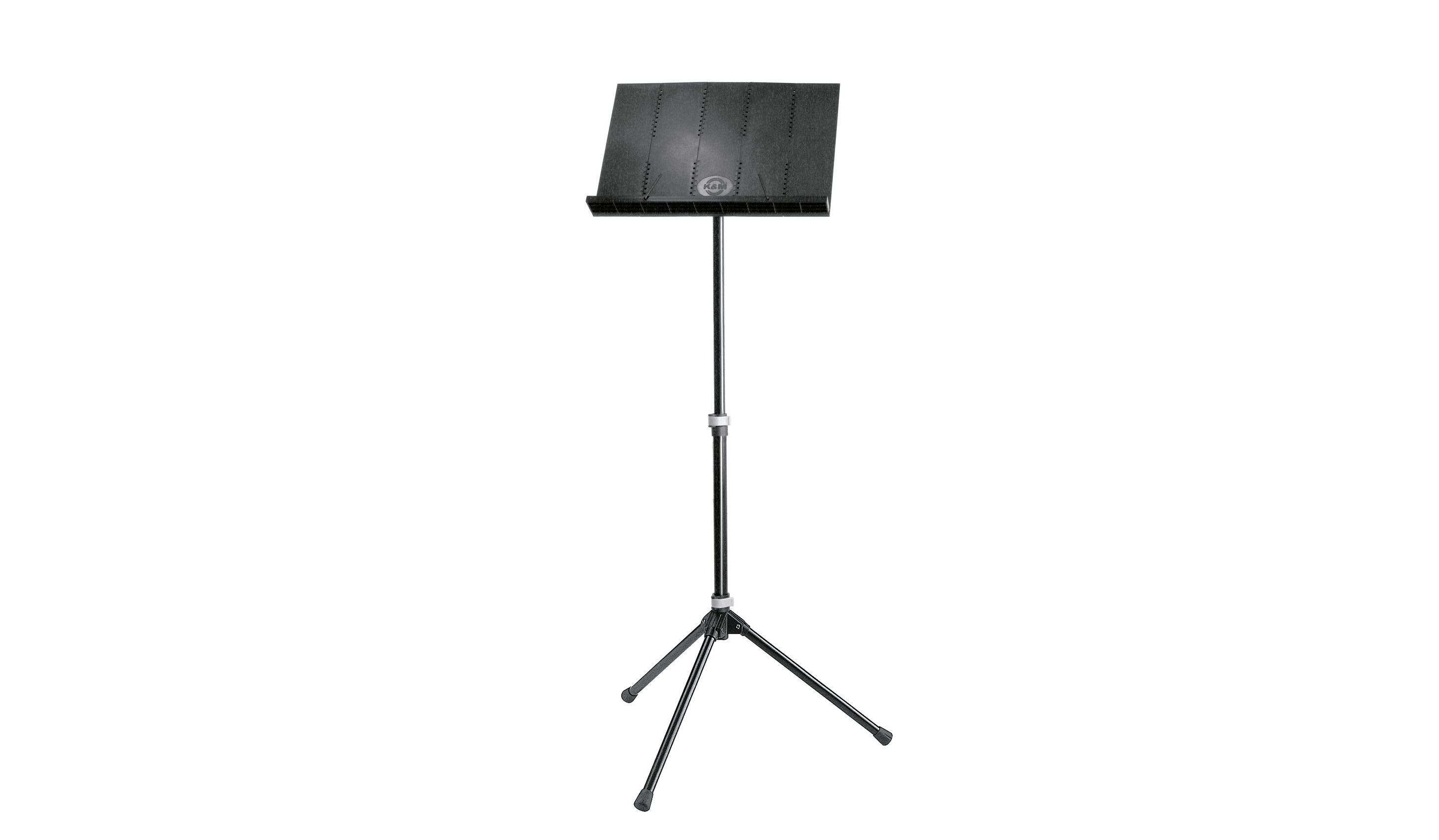 עמוד תווים תזמורתי מקצועי 12120 בגימור שחור, עם משטח תווים מתקפל אביזרי חיבור מפלסטיק באיכות גרמנית. משטח התווים המרווח במידות 340X305 מ״מ נשאר מוחבר לגוף העמוד אך מתקפל על עצמו ומגיע לימדה קומפקטית ונוחה לנשיאה ושינוע. העמוד מצוייד במנופי נעילה מהירה ללא ברגים לנוחות ויעילות מקסימלית בעט כיוון גובה עמוד התווים. העמוד מתכוונן בקלות לכל גובה בעזרת סוגרי פלסטיק שאינם שורטים את גוף העמוד ומגיע עם תיק נשיאה מבד קורדורה לשינוע נח.