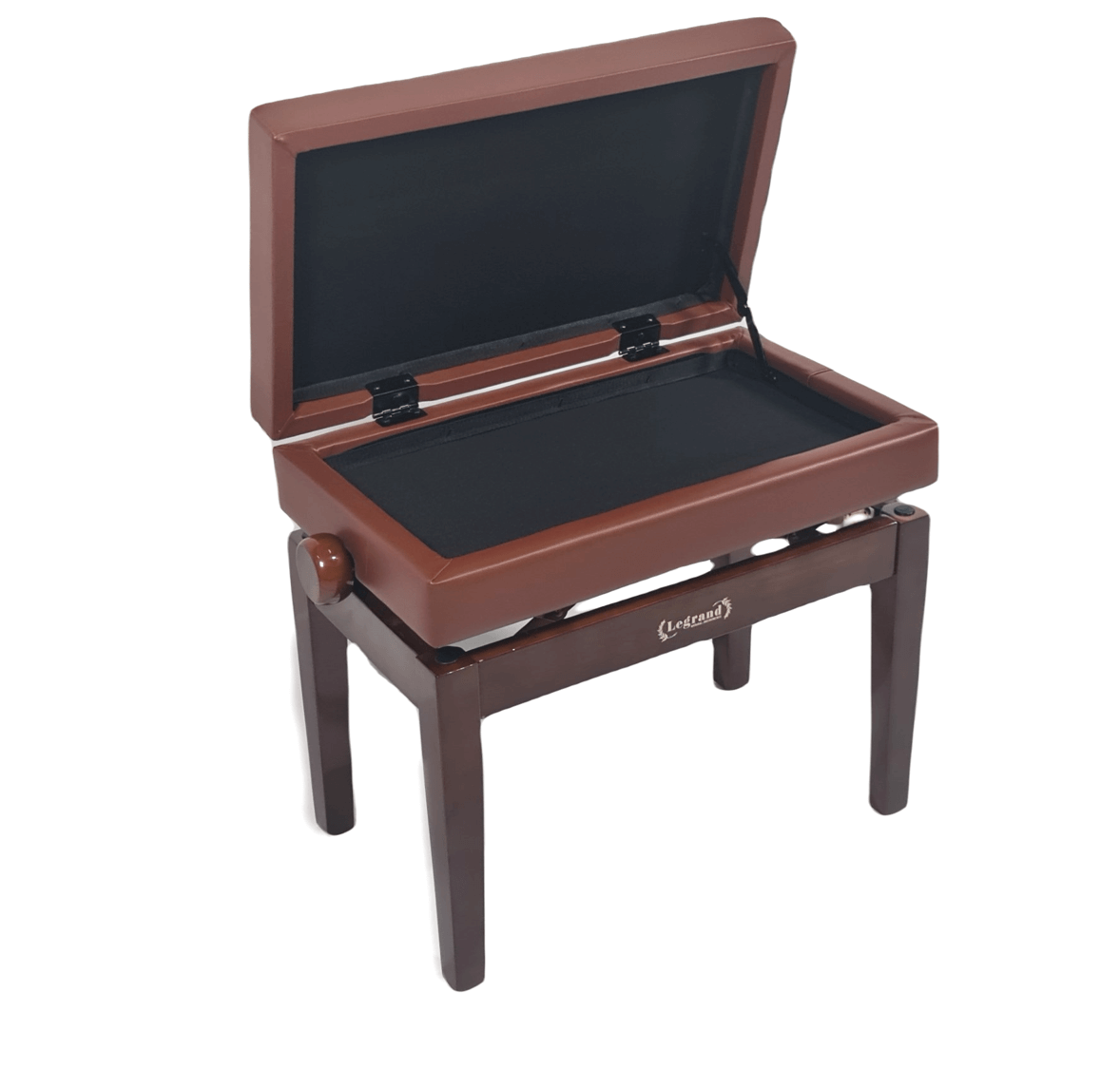 כסא פסנתר מתכוונן עם תא איחסון בצבע וולנט מבריק ומושב דמוי עור בצבע חום כהה עם קפיטונאז’ PB7 מבית Legrand