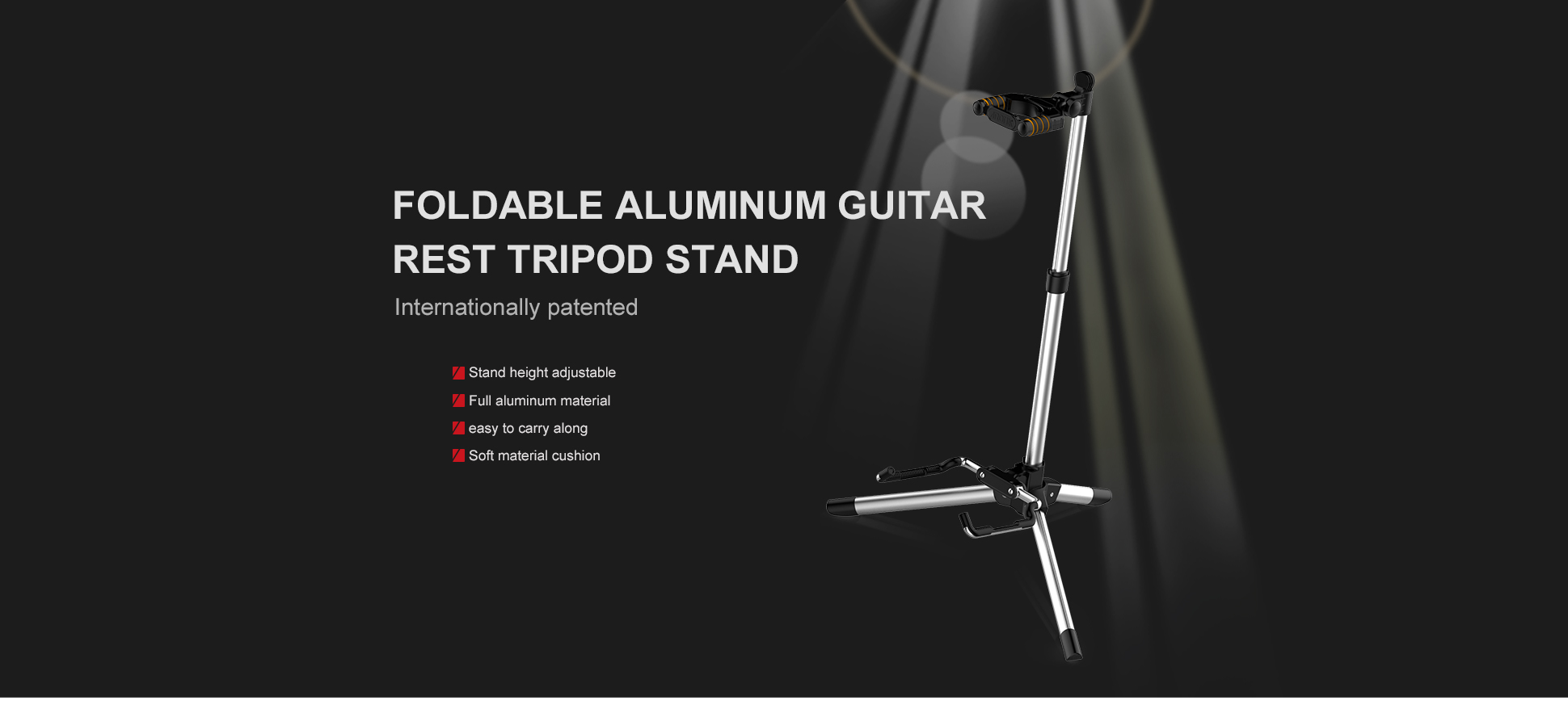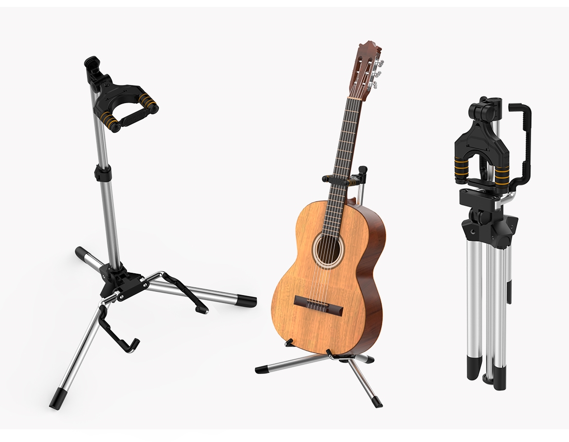 מעמד גיטרה אוניברסלי מתקפל בעיצוב חדשני המגיע עם חצובה יציבה בעלת 3 רגליים, גוף אלומיניום חזק ונעילה בראש הסטנד לשמירה מירבית על הגיטרה שלכם מבית AROMA
