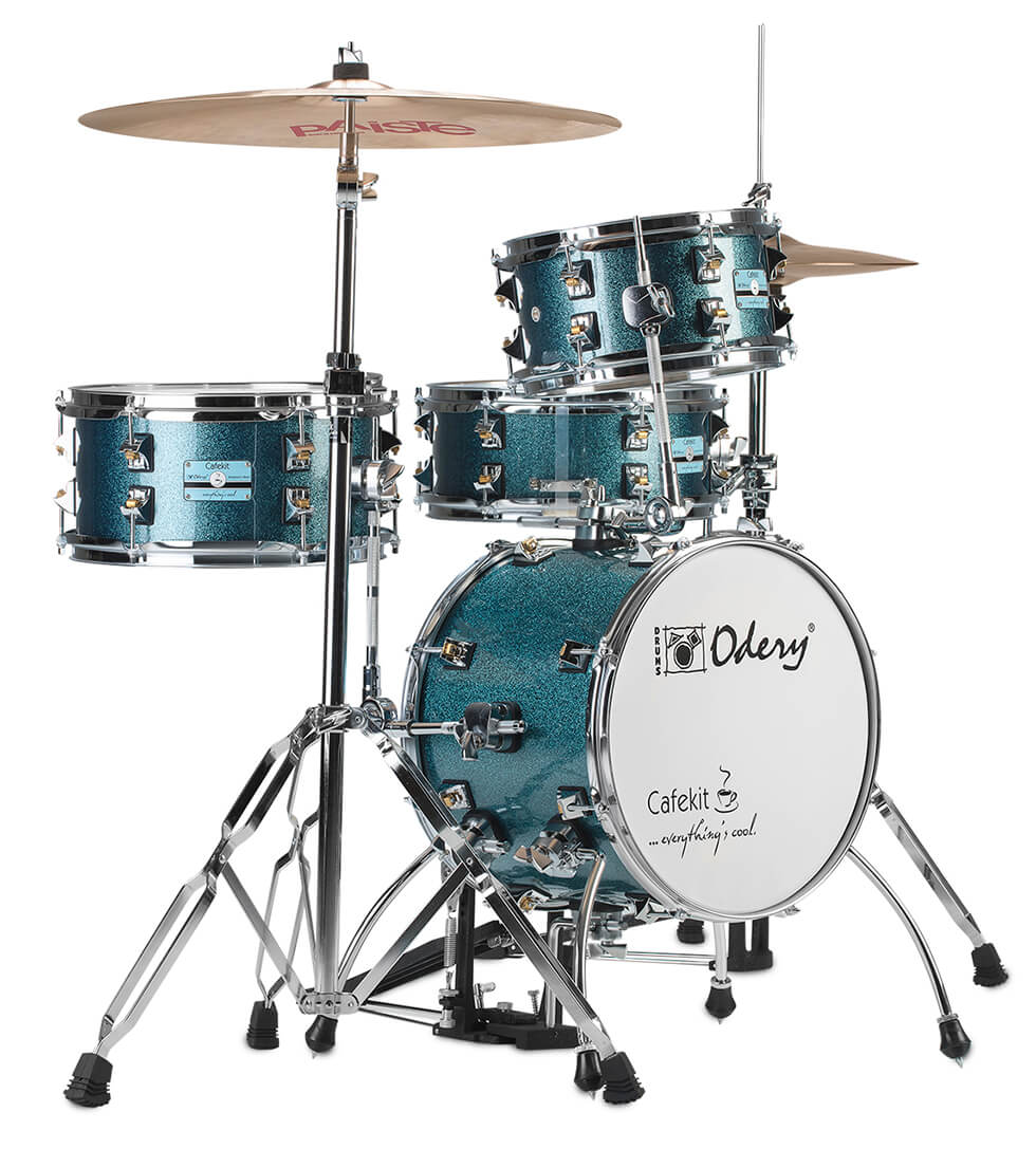 מערכת תופים "14 קומפקטית וייחודית 4 חלקים + איבזור מסדרת CAFEKIT בצבע טורקיז מנצנץ מבית Odery-(Brazil)