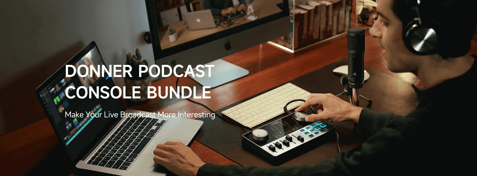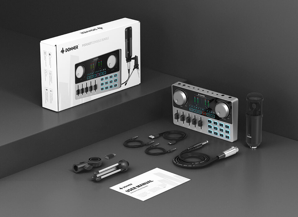 ערכת פודקסט קומפקטית ומדהימה עם כל מה שצריך המגיעה עם קונסולה בעלת 12 (לחצנים) Sound Effects Regulation, אלמנט ה EQ, אפקט REVERB ועוד אפשרויות מדהימות לשידור ברמה גבוהה כולל מיקרופון קונדנסר מבית DONNER