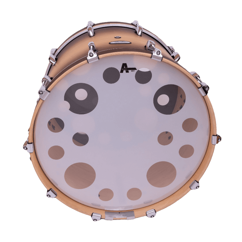• Technically speaking, the Orbit batter bass drumhead is comprised of a 10 mil clear Dynaflex film for the top-ply. For the under-ply, Attack uses a 10 mil nebulous white Dynaflex film with calculated sized and placed orbs. For our resonant ported bass drumhead, we replace the under-ply head with the 10 mil black Dynaflex film. Attack chose to include the Holz branded 4” porthole to protect and give that perfectly finished appearance.