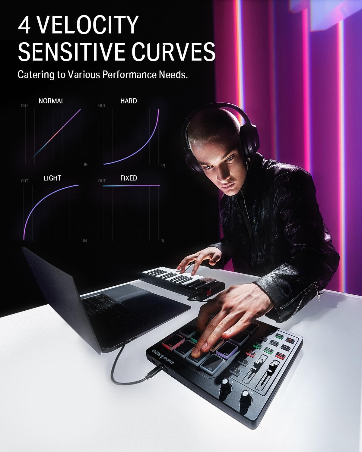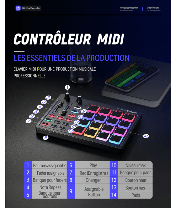 מקלדת השליטה מגיעה עם 16 פדים מוארים ורגישים המאפשרים טעינת ביטים של תופים, סמפלים אפקטים וכך תוכלו להקליט את עצמכם או לתת הופעת לייב עם המקצבים שלכם בסטייל שלכם ! בלחיצת כפתור תוכלו לנוע במהירות בין 3 בנקים של פדים מה שנותן לכם 48 סאונדים שונים לנגינה. המקלדת מגיעה עם 2 נובים, 2 פיידרים, כפתור REC ו-PLAY וכל מיני כפתורי שליטה שיאפשרו לכם לשלוט על היצירה שלכם ולהגיע לתוצאות שאתם רוצים תוך כדי עבודה מהנה ונוחה. מכונת הביט מגיעה עם ספק כוח USB C סטנדרטי וממשק נתונים לחיבור נוח וקל – plug and play. אין ספק שה DPD10 נותן מענה מצוין לאולפנים ביתיים ולכל מיני הפקות של נגינה בלייב…