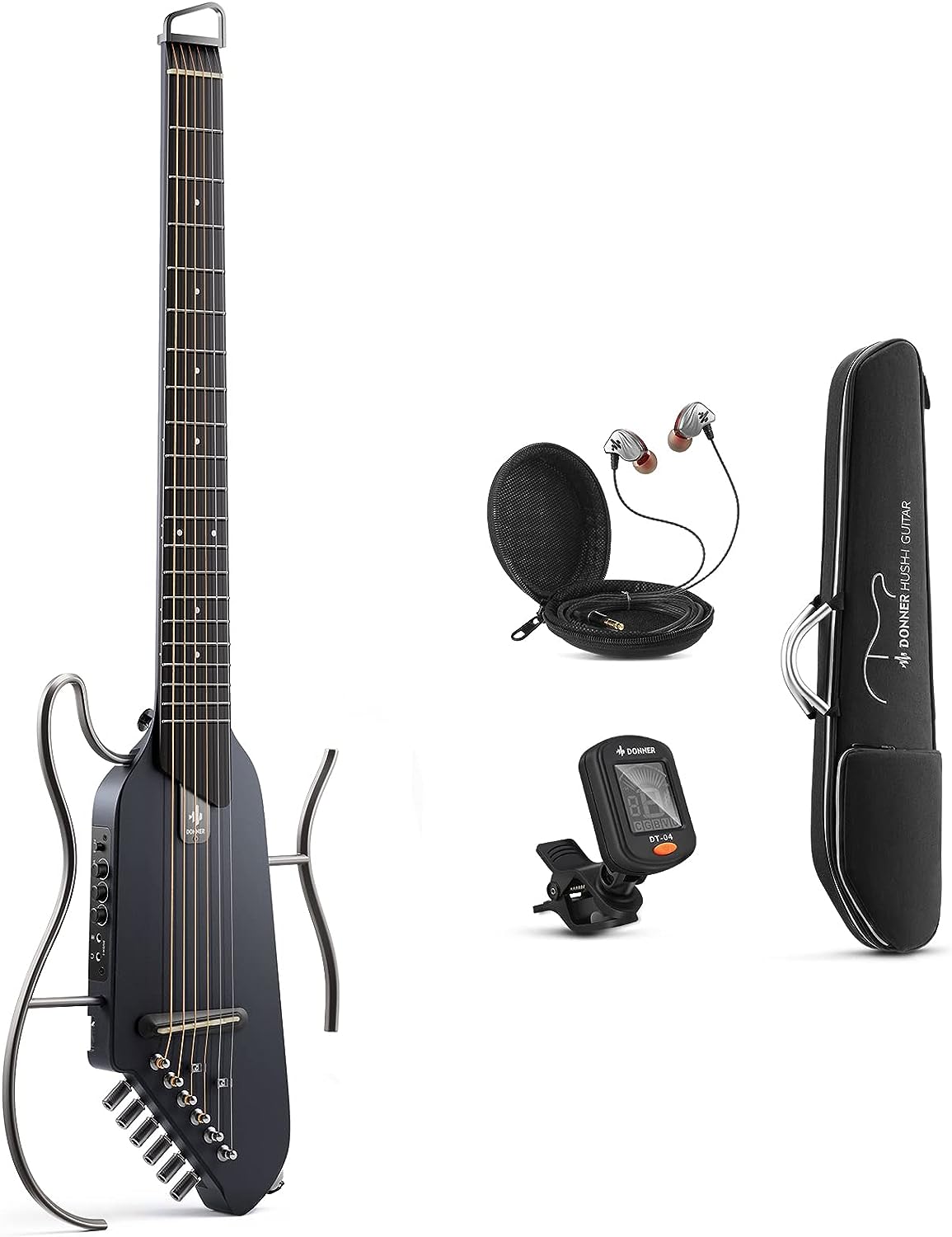 גיטרה שקטה EC1782 אקוסטית מוגברת בעיצוב חדשני HUSH I בצבע שחור | גיטרה לטיולים מבית DONNER + טיונר פדל - PT-5 Musedo | טיונרים דיגיטליים =