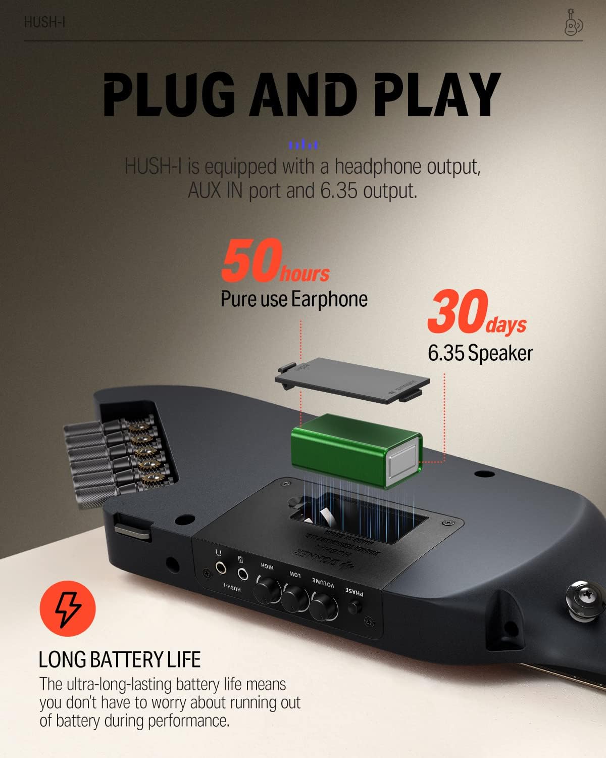 כמו כן הגיטרה מאפשרת להתחבר למגבר וכך תוכלו לנגן בחדרי חזרות ואף להופיע עם הגיטרה כמו גיטרה מוגברת רגילה. ה HUSH-I מופעל על ידי סוללת 9v (מגיע עם הגיטרה), המספקת 50 שעות של שימוש באוזניות או 30 יום של שימוש ברמקול. בנוסף אודות למשקל המינימליסטי שלה תוכלו לקחת אותה איתכם לכל מקום ובקלות ! ממש כאילו אתם סוחבים איתכם את הלפטופ שלכם.