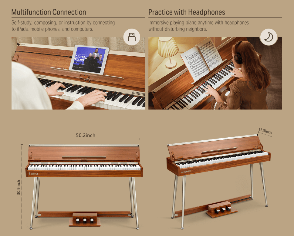 פסנתר חשמלי בעיצוב Retro רטרו 88 קלידים שקולים בצבע חום DDP-80 PLUS מבית DONNER