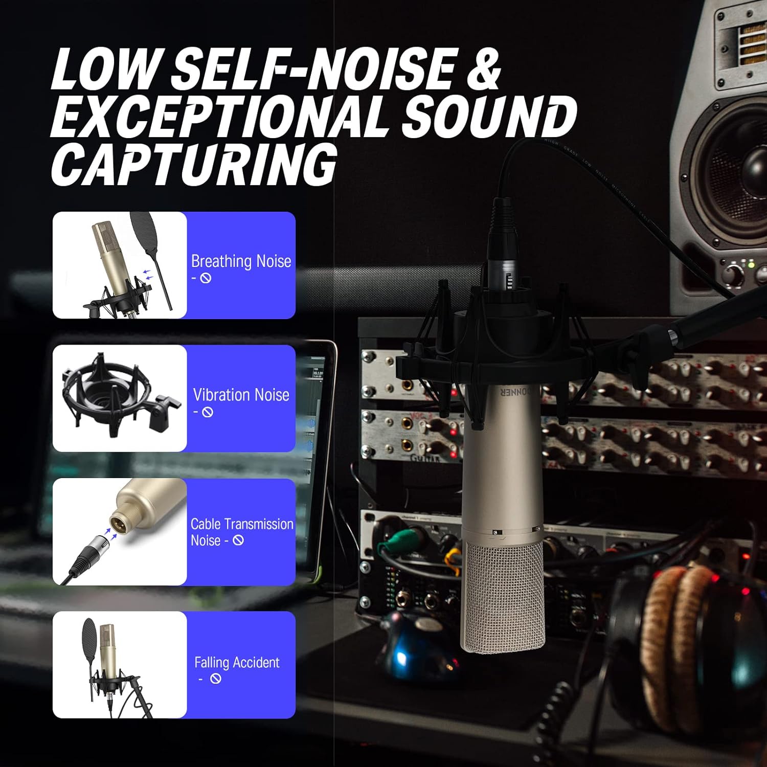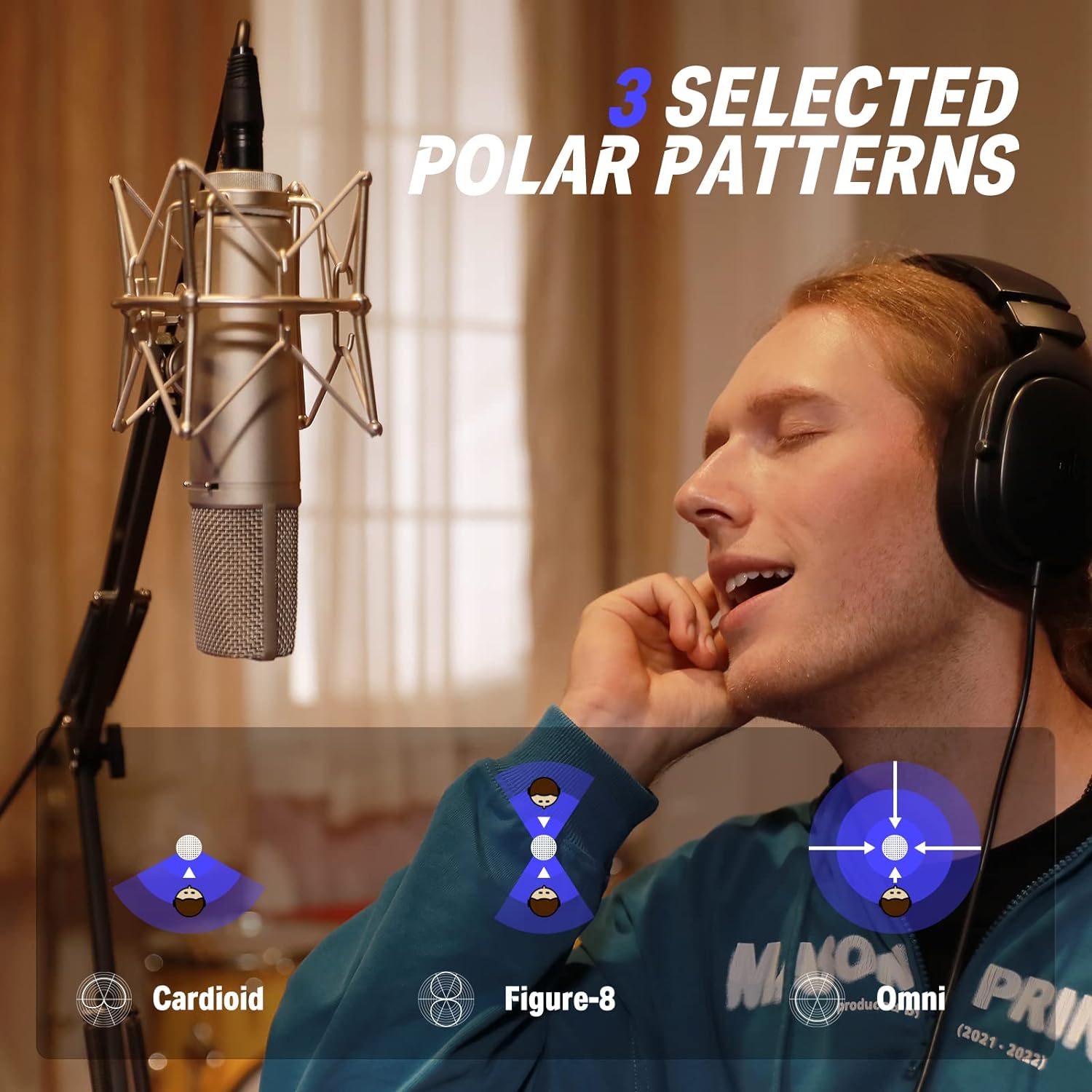 מיקרופון קונדנסר מדהים עם דיאפרגמה של 25.4 מ"מ, כוח פאנטום ו-3 תבניות פולאריות לבחירה מבית