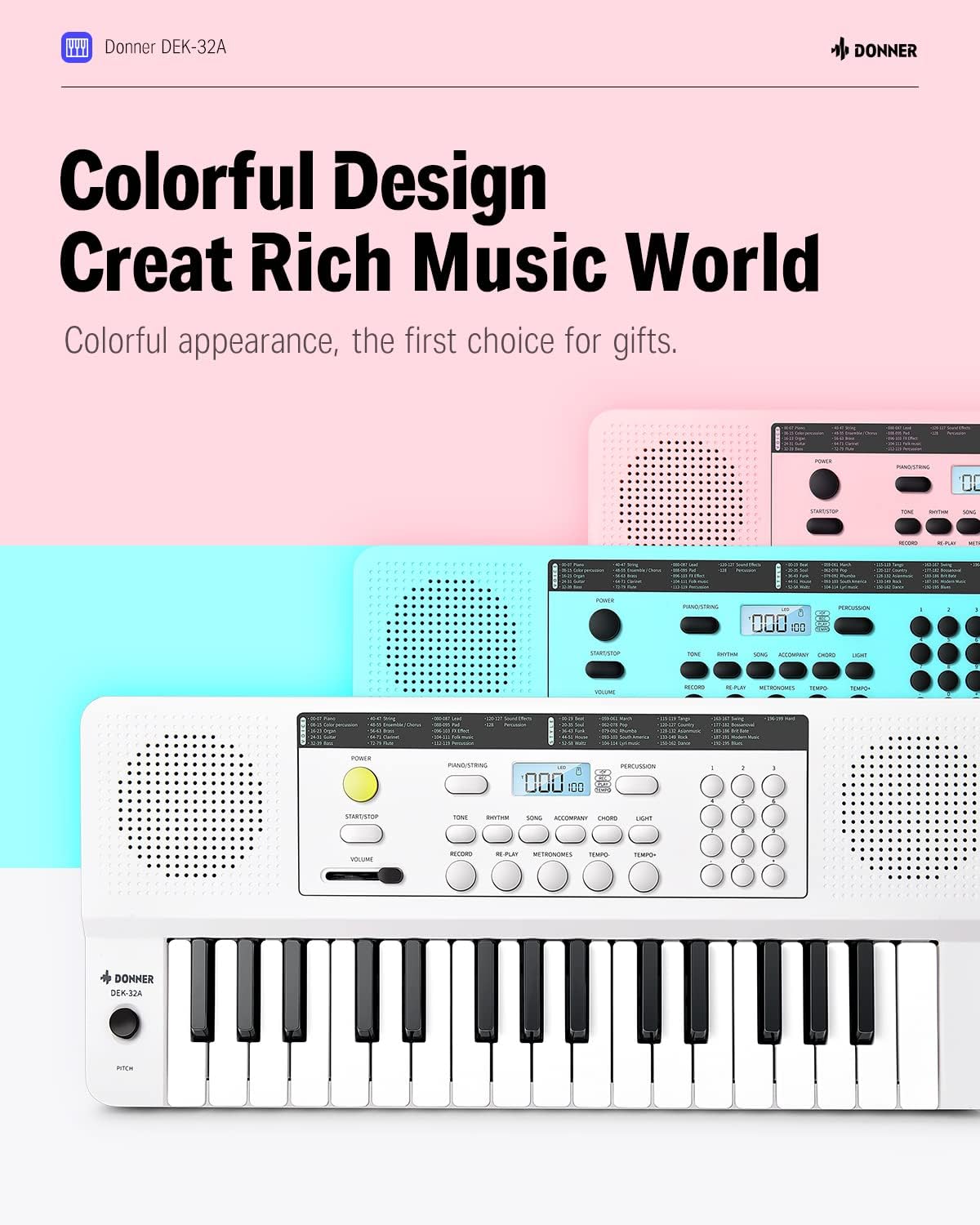 הגיע הזמן להכניס את המוסיקה לחיים של הילדים המתוקים שלכם !EC3222 דונר הבינלאומית מביאה לנו קלידים מיני במיוחד לילדים 32 צלילים עם שלל אלמנטים ופונקציות שיעשו חשק לילדים לנגן…ובסטייל ! DEK-32A