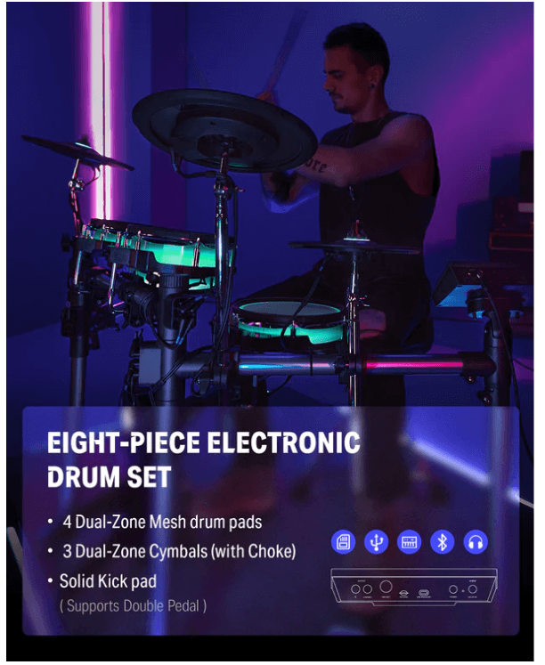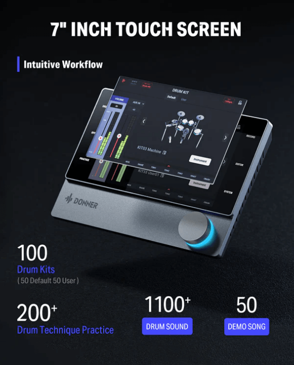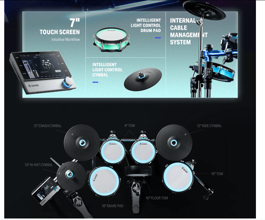 מערכת תופים אלקטרונית מרהיבה עם מסך טאץ’ BACKBEAT ותאורת לדים מבית DONNER