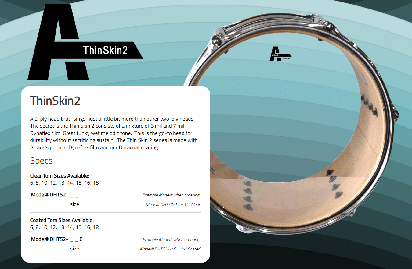 A 2-ply head that “sings” just a little bit more than other two-ply heads.  The secret is the Thin Skin 2 consists of a mixture of 5 mil and 7 mil Dynaflex film. Great funky wet melodic tone.  This is the go-to head for durability without sacrificing sustain.  The Thin Skin 2 series is made with Attack’s popular Dynaflex film and our Duracoat coating.