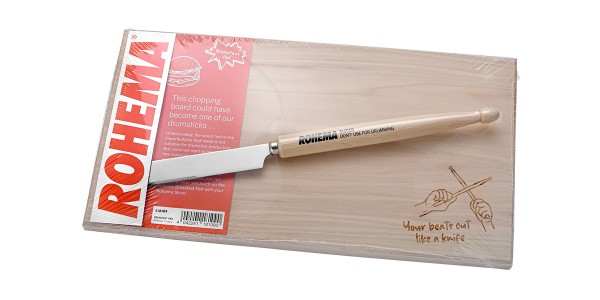 פד ארוחת בוקר :) 618109 קרש חיתוך עם סכין המחוברת למקל תופים המיוצר מ-American Hickory מבית ROHEMA (GERMANY)