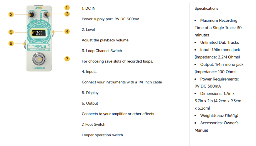 פדל לופר לגיטרה 3 מצבי שמירה EC1211 Triple Looper Guitar Pedal מבית DONNER מחיר 641 ₪