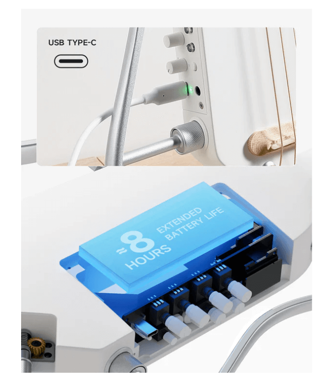 ה HUSH-I נטען ע"י כבל USB-C (מגיע עם הגיטרה), המאפשר נגינה של כ-8 שעות.