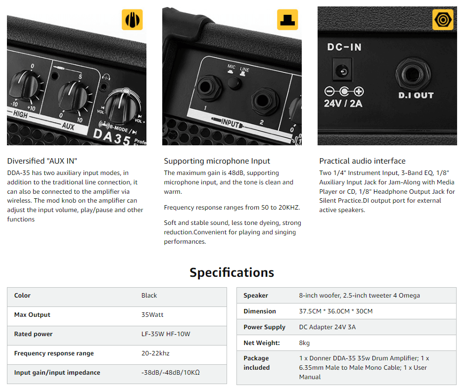 מגבר לתופים אלקטרוניים 35W כולל טוויטר DDA35 EC1709 מבית DONNER