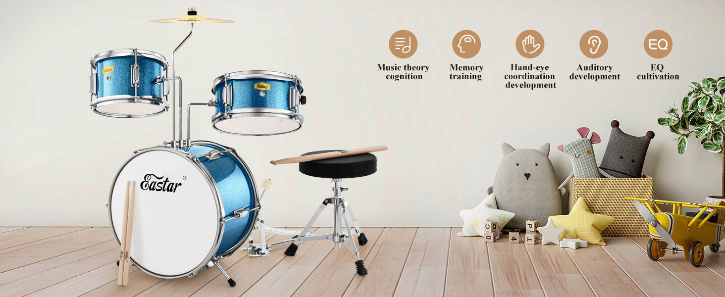 ערכת מערכת תופים המעוצבת במיוחד לילדים בצבע מהפנט ! המערכת מגיעה עם תוף בס בקוטר 14 אינץ’, טם, סנר, מצילה עם סטנד, כסא, מקלות תופים ובקיצור כל מה שצריך כדי שהילד שלכם יתחיל לנגן ובסטייל ! מבית EASTAR