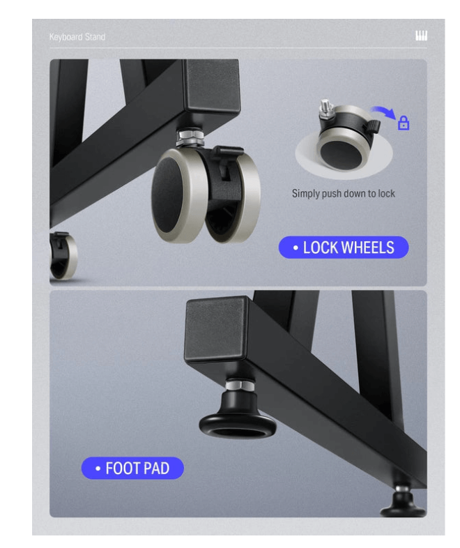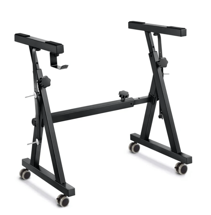 סטנד קלידים מהפכני ! מתכוונן בקלות לגובה ולצדדים ! מתאים לאורגניות ולפסנתרים חשמליים 54-88 קלידים. הסטנד מסיבי עם גלגלים (כולל נעילת גלגלים) המאפשרים שינוע במרחב לנוחיותכם ! מבית DONNER העולמית