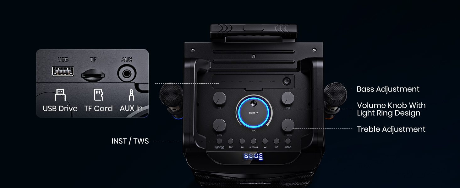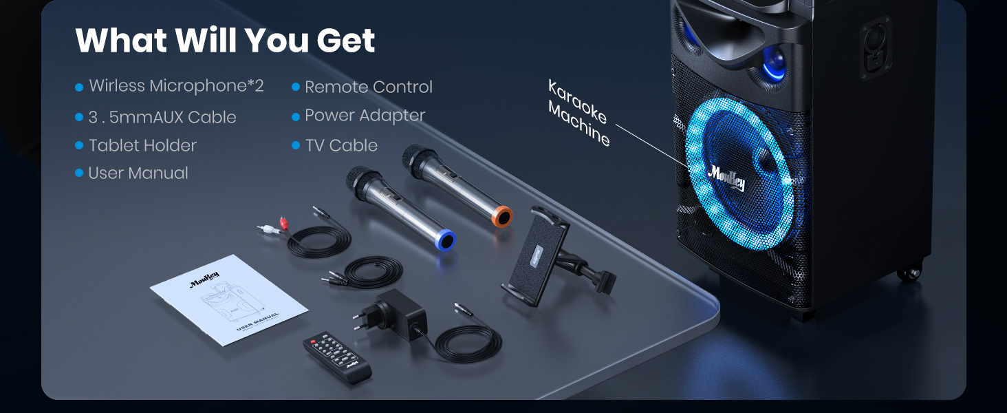 MOUKEY מביאה לנו חבילת קריוקי עם אורות לד וסאונד שיפתיע אתכם לטובה ! הערכה כוללת שני מיקרופונים Wirless + מחזיק טאבלט + שלט + כבל AUX + אלמנט הבלוטות’ ובקיצור חגיגה של ממש ! מבית MOUKEY