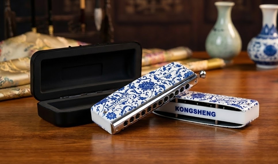 מפוחית כרומטית פרימיום Kongsheng Lyra SC-12 Blue&White Edition עם 12 חורים, סולם דו מז’ור, גוף אלומיניום מעובד CNC, מכסי נירוסטה בעיצוב כחול-לבן מסורתי.